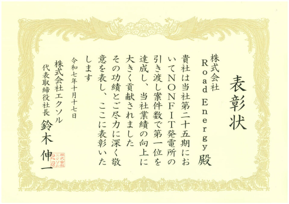 このたび、株式会社Road Energyは、株式会社エクソル様より表彰状を賜りました。